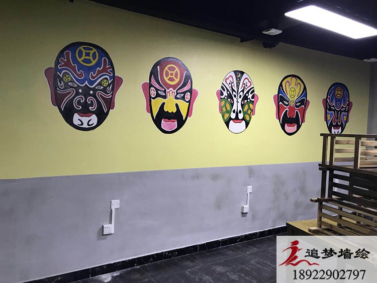 墙绘项目介绍:根据客户的要求,我们结合了传统戏剧花旦人物和五财神脸谱,长墙上也做了一些火辣的辣椒图案,让店铺看起来更加的红红火火,风味十足。