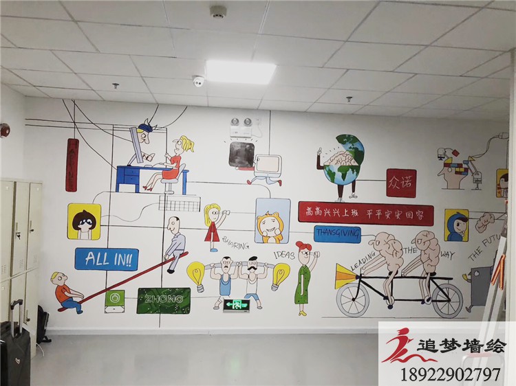 墙绘项目介绍:该办公室墙绘运用线条与曲线的结合,营造出一种激情、斗志的工作
