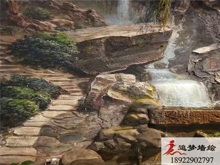 墙绘项目介绍:该项目的浮雕立体画采用了写实和场景相结合的方式,在适当的位置绘制具有代表性的山水和场景,给人以直观的感受,避免了平面的单调和乏味。画面中的无论是高耸的山峰,还是锦鲤的脉络纹理,都有着恰到好处的光影分割,展示在眼前的就是一道高山流水的美丽风光,整个画面跳跃在脑海,令人仿佛置身于山水之间,生动形象。