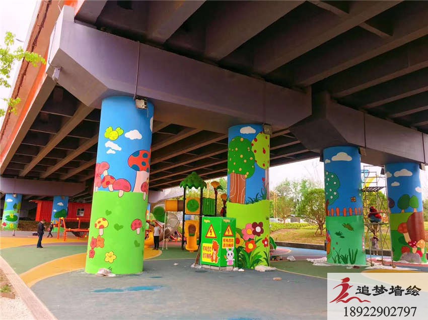 项目介绍: 该高速桥墩墙绘项目周边是儿童娱乐场所,要求突出童趣的气息,为了满足不同小朋友的审美观,在墙面上选用了蘑菇,小动物拟人的卡通角色,整体背景是绿色的树木和草地、蓝天白云等主题的布置,色调明快,具有童趣气息,给人以温馨的感觉!作品已完成,敬请欣赏!