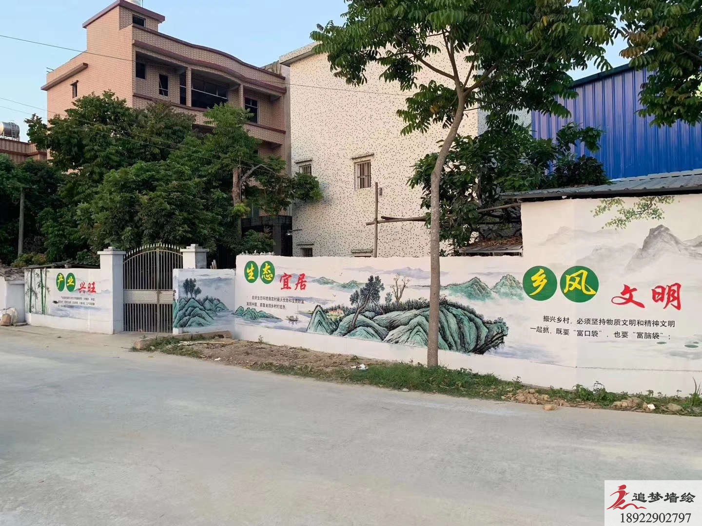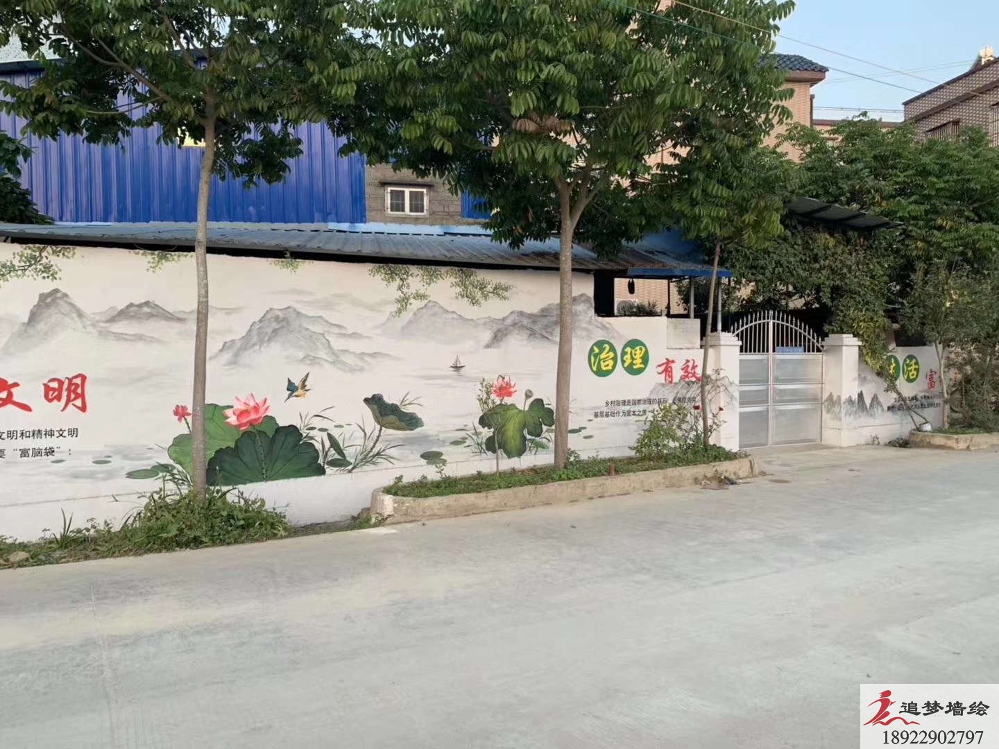 墙绘项目介绍:这次的项目主要绘制彩绘图案整体设计围绕乡村振兴战略为主题,突出美化环境的主题。图案是以乡村气氛为主的山水,荷花,采用图文结合的表现形式,突出了自然。墙绘整体基调乐观积极向上